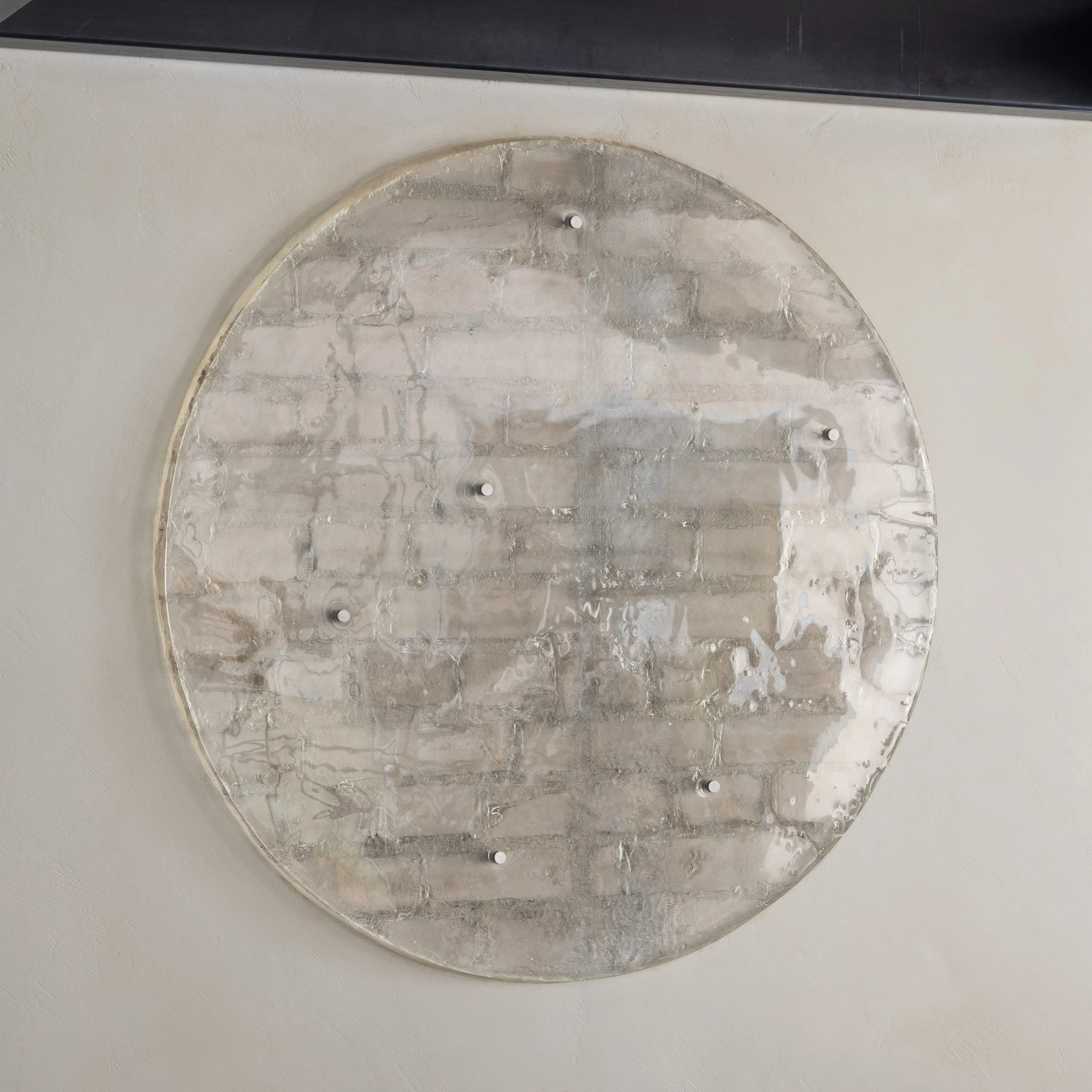 Thilo Reich’s Temporal Imprint series consists of large-scale glass castings of sections of buildings that reveal forgotten histories of production and traces of their former inhabitants. Using a 4-step process, Reich’s reliefs are created by excavating a circular piece of wall (often buried under many layers of other building materials), taking a silicon imprint, creating a mould and finally, a glass casting.